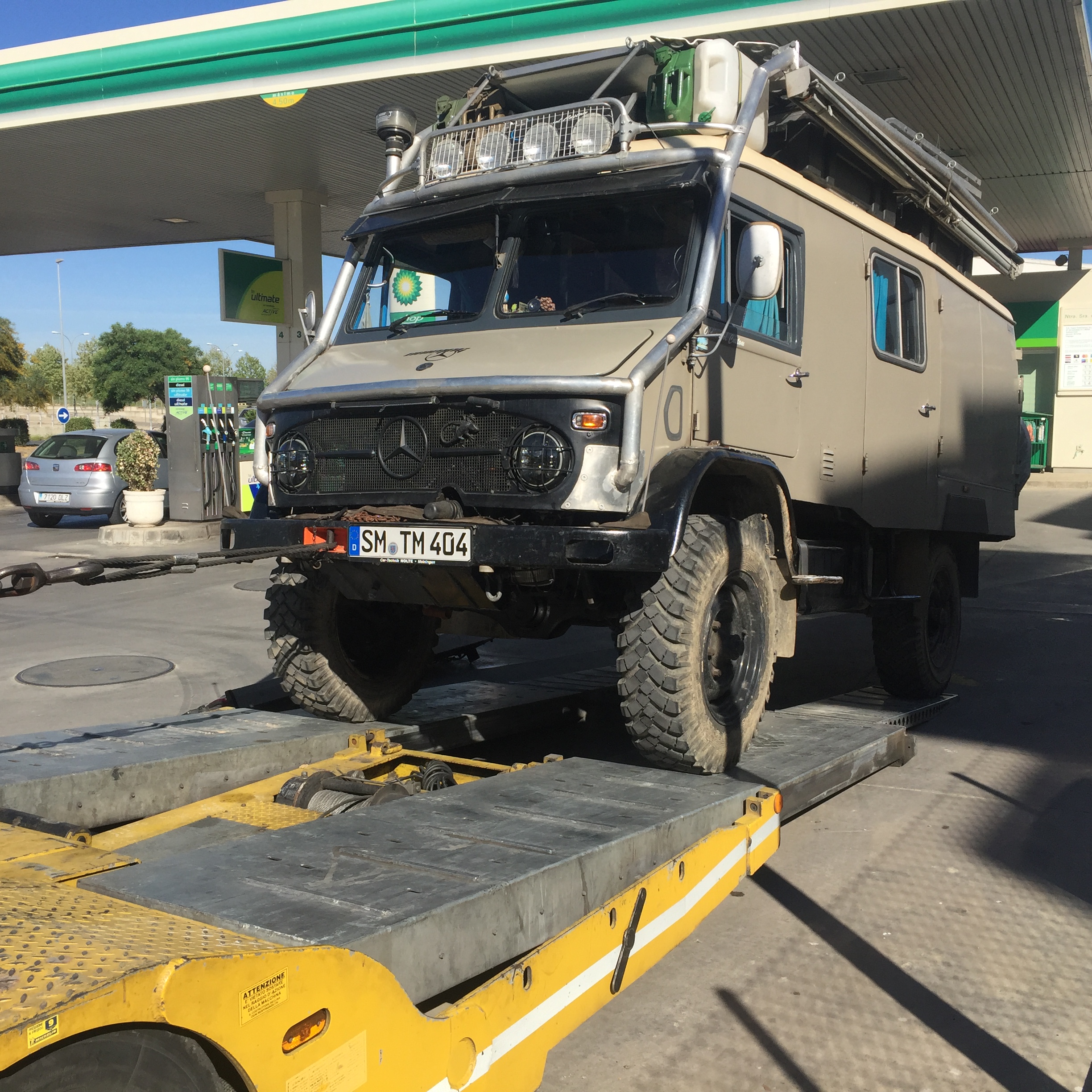 Erfreut ist der Tankstellenbesitzer freilich nicht, aber was nützt alles Jammern? Es ist Samstagnachmittag, Spanien schon im „Wochenendmodus“ und wir erst mal im Arsch. Über das Tankstellenwifi können wir wenigstens unsere genauen Koordinaten rausfinden und nach Germany telefonieren, „ADAC-Auslandsabteilung“. Paar Mal hin und her, wird uns dann für Montagmorgen ein Abschlepper organisiert. Ach ja, es geht nach Alcala de Guadaira. Nach wo? Noch nie gehört, kann man noch nicht einmal richtig aussprechen! Okay! Jetzt erst mal tranquilo, wie der gemeine Spanier zu sagen pflegt, runterfahren, durchatmen…