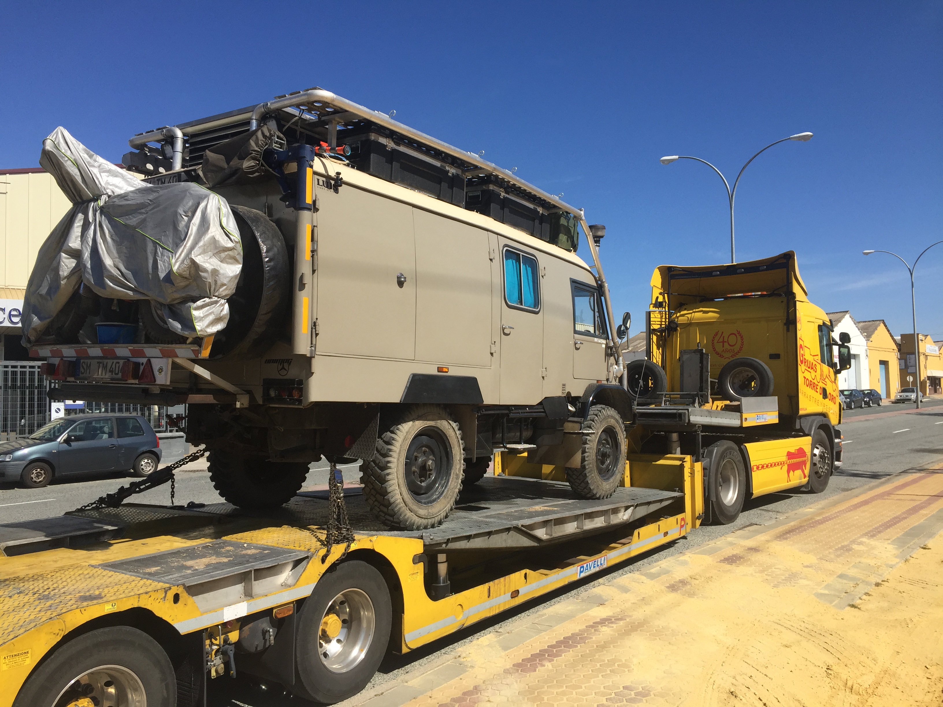 Der Montagmorgen ist schnell da, der Abschlepper dann auch. Der Rest ist Formsache: Kurze Absprache, aufladen, verzurren, Papierchen ausfüllen und los. Der dicke gelbe Scania-Abschlepper rauscht auf einem lustig geschwungenen Asphaltband, vorbei an riesigen Industriegebieten mit Fabriken und allem nur erdenklichem Gewerbe, ziemlich komplex das Ganze.